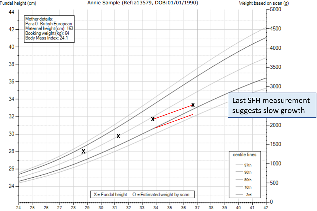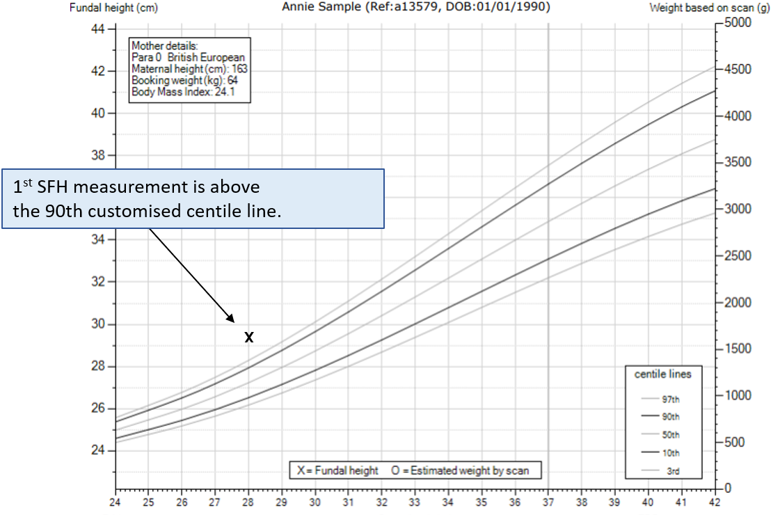 A first SFH measurement below the 10th centile MAY be an indication of SGA and of potential concern as a single measurement cannot reassure that the growth rate is normal. Therefore it is an indication for an ultrasound scan to determine the EFW which should be plotted, with further management as set out in the GAP guidance.
