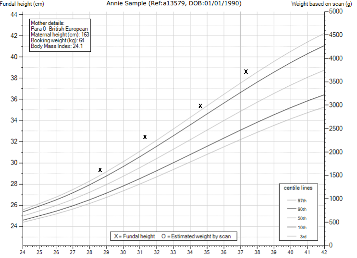 The charts delineate the optimal growth rate in each pregnancy, to the ‘term optimal weight’ which the software determines by customising according to the physiological characteristics of each mother in each pregnancy.