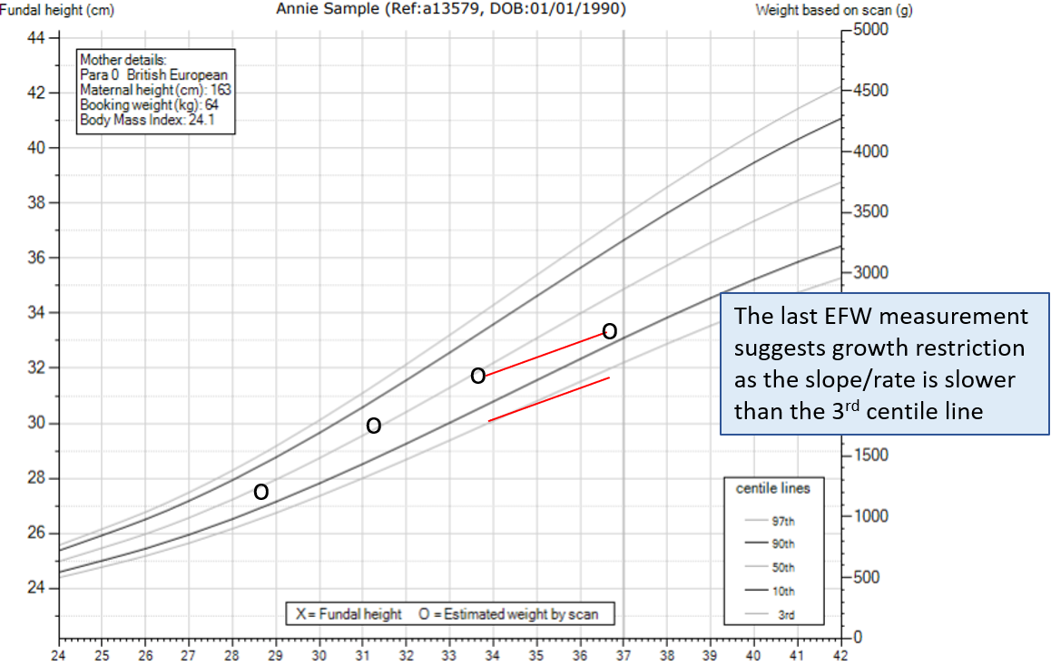 Example of SLOW / RESTRICTED GROWTH based on scan estimated fetal weight. For serial EFWs the cut-off limit for ‘FGR’ is when the growth rate between measurements is slower than that of the 3rd centile line, over the same gestational age interval.